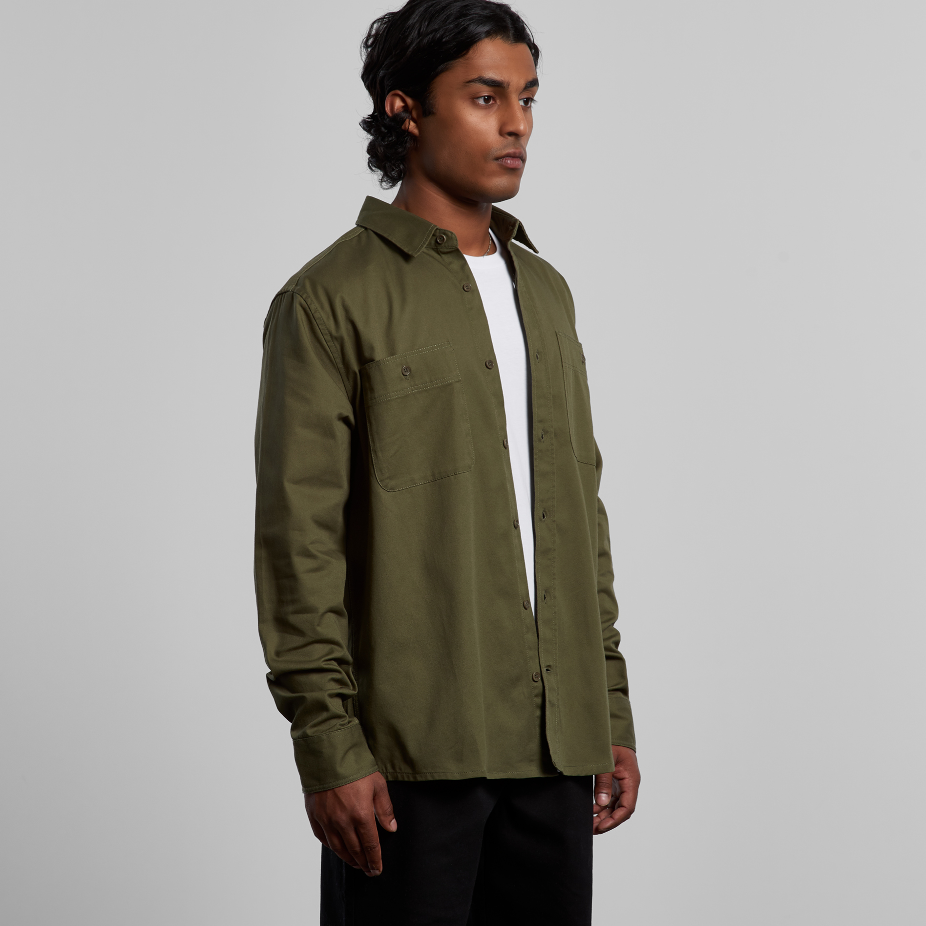 Long sleeve button up shirt, two chest pockets with pen channel, tonal buttons,  side seamed, back yoke with hang loop, preshrunk to minimise shrinkage